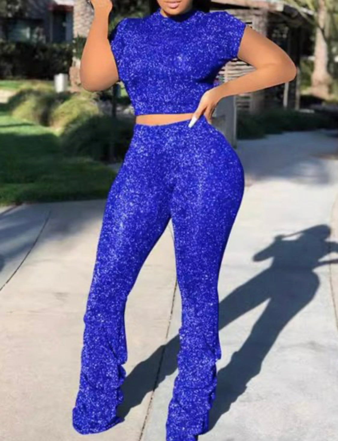 Command attention in this stunning two-piece royal blue glitter set. With a curve-hugging fit and stacked leg detail, this set delivers bold energy and luxe sparkle. Whether you're stepping out for a night under the lights or making streetwear glam, this look turns heads effortlessly.