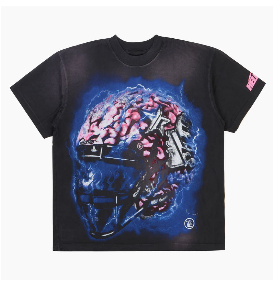 Step into bold streetwear energy with the Hellstar Powered By The Star Tee. This vintage black t-shirt features a striking front graphic of a football helmet powered by lightning and vivid neon tones, symbolizing strength and rebellion. The back showcases the “Powered By The Star – Path to Paradise” print in standout pink and blue, bringing a statement finish from every angle.