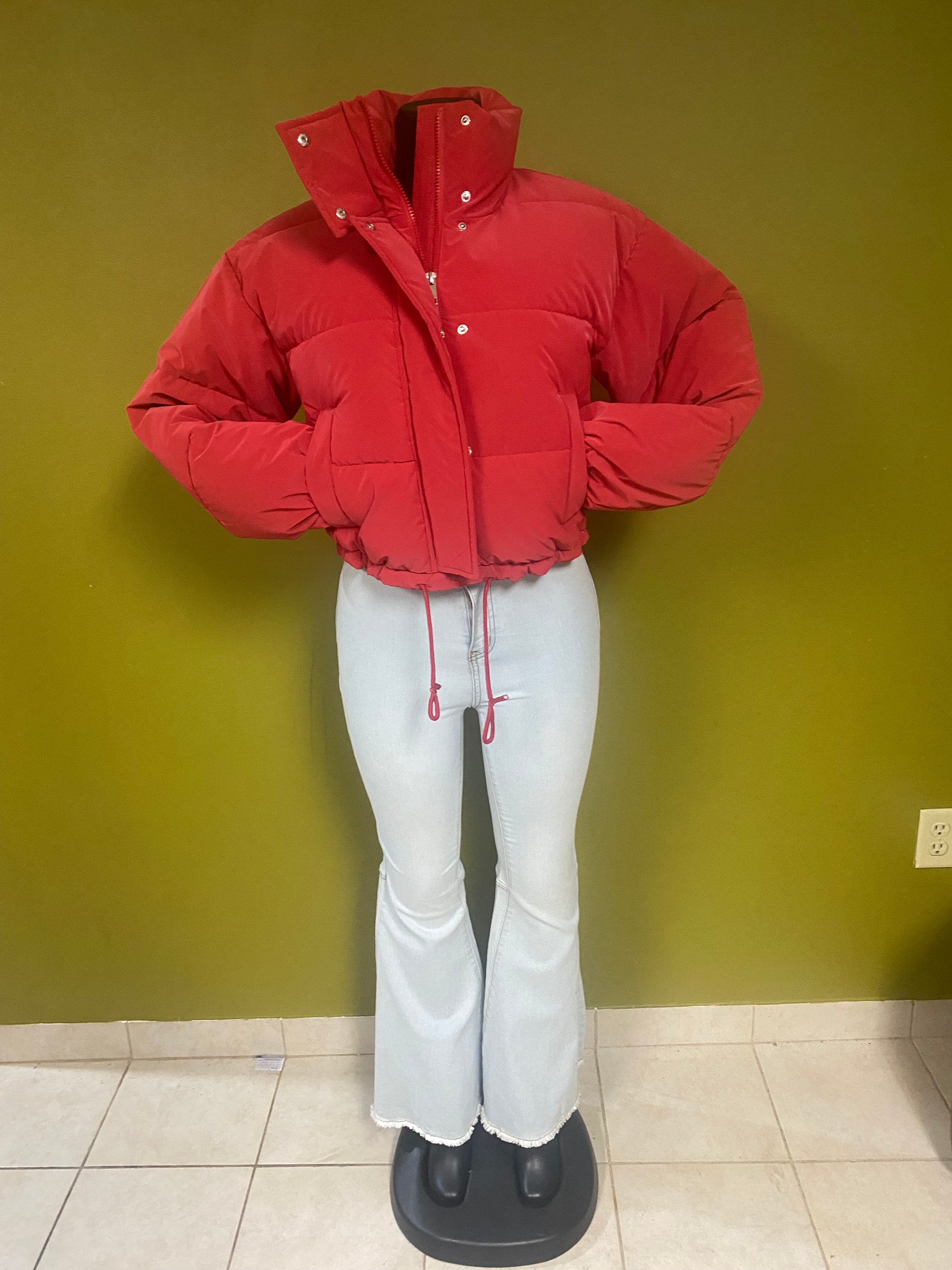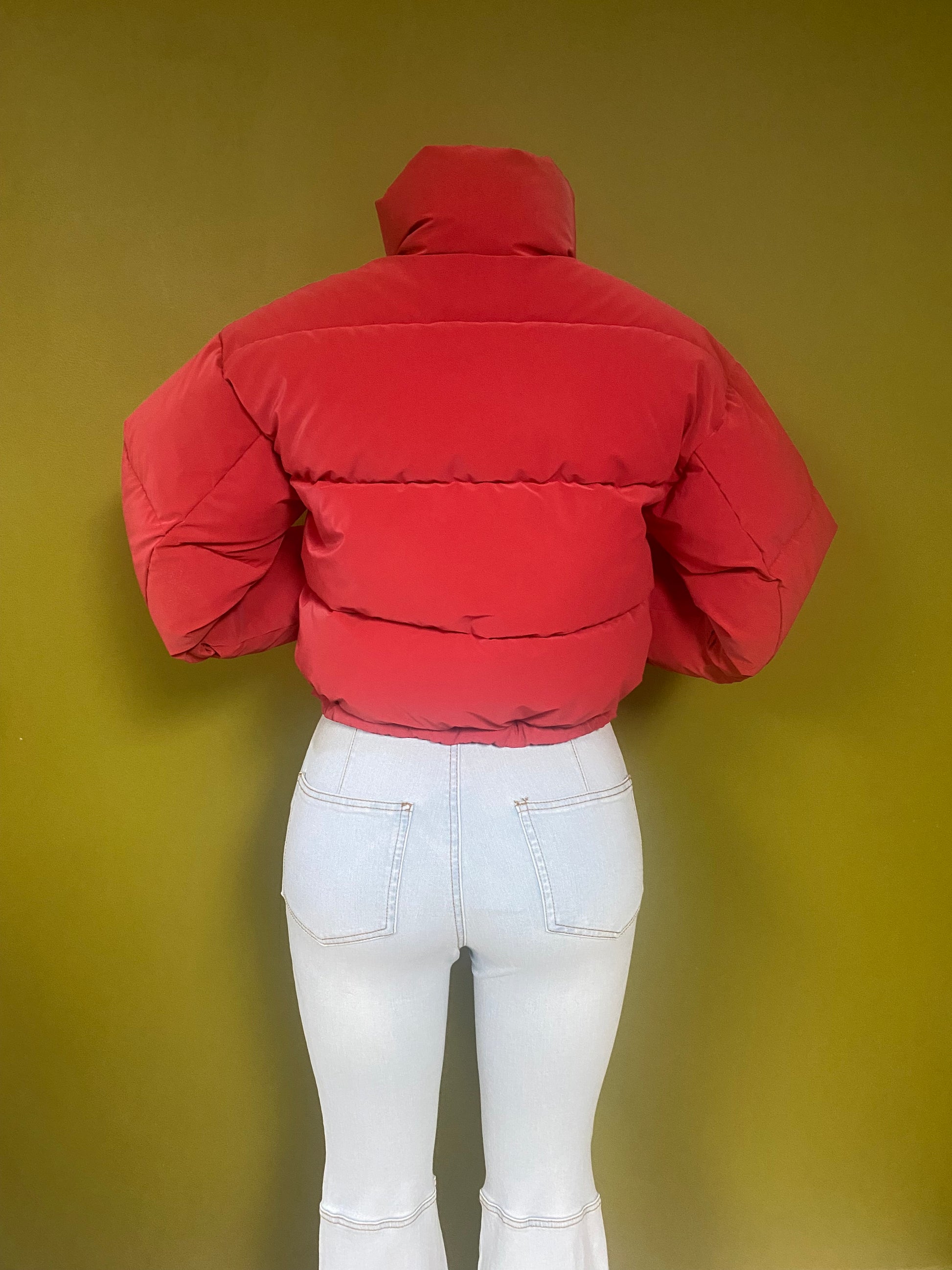 Stay warm and stand out in this bold hot pink cropped puffer. Designed with a cinched waist and high collar for that model-off-duty vibe — cozy, soft, and statement all in one.
